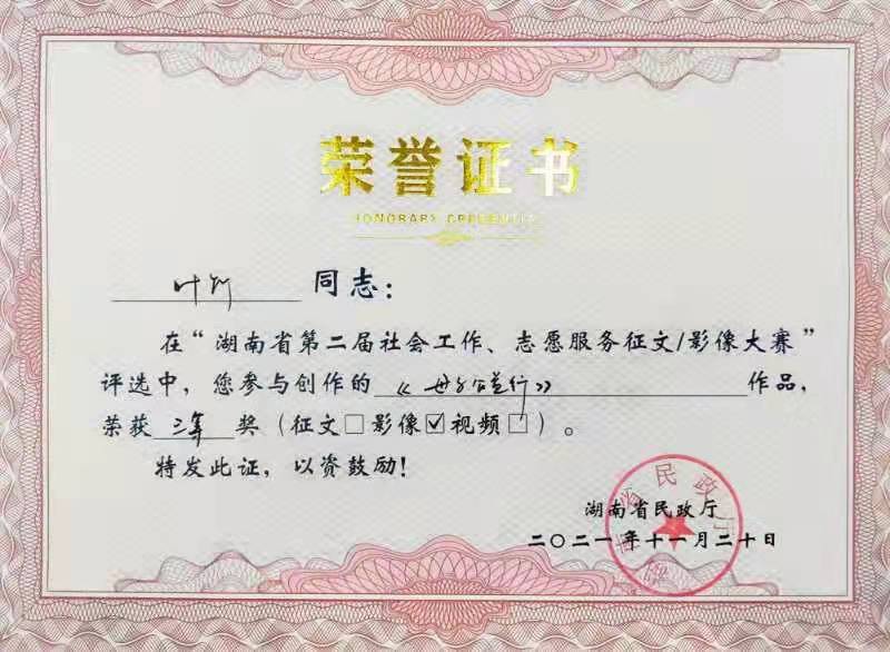 2021年,我司多名員工積極踴躍投稿參與由湖南省民政廳主辦、湖南公共頻道承辦的湖南省第二屆社會(huì)工作、志愿服務(wù)征文暨影像大賽。他們講述平凡而偉大的故事,展現(xiàn)社會(huì)工作者精神風(fēng)貌,傳播真善美,弘揚(yáng)正能量。其中兩篇原創(chuàng)征文作品、三幅原創(chuàng)影像作品在比賽中脫穎而出,榮獲一等獎(jiǎng)1個(gè)、三等獎(jiǎng)3個(gè)、優(yōu)秀獎(jiǎng)1個(gè)。